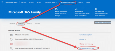 The Microsoft 365 Family 15-month code can be used to extend an existing Family plan under ‘Redeem a card or code’.