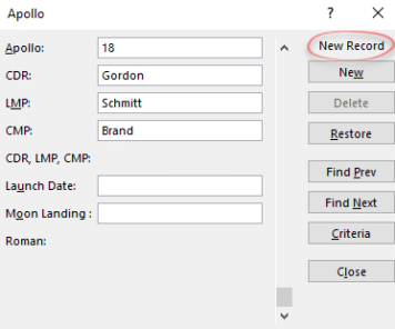 Another way to add a new record is to scroll to the bottom of the list using the Down or PageDown keys. If you go past the last record/row, the ‘New Record’ option appears.