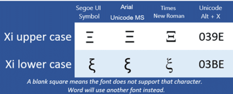 Here’s some examples of how the Xi upper case and Xi lower case symbols look in common Office fonts in Word 365.