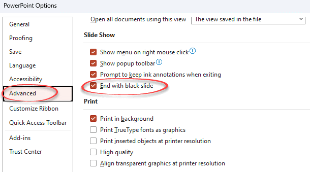 Uncheck the option and when you view the slideshow the black slide will not appear at the end of the presentation. Instead, the slide show will exit and your audience will see your copy of PowerPoint or whatever is open on your computer. That isn’t very professional.