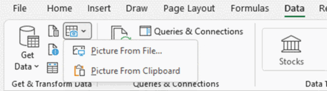 Excel’s Data from Picture is tucked away on the Data tab among all the Get & Transform Data options.