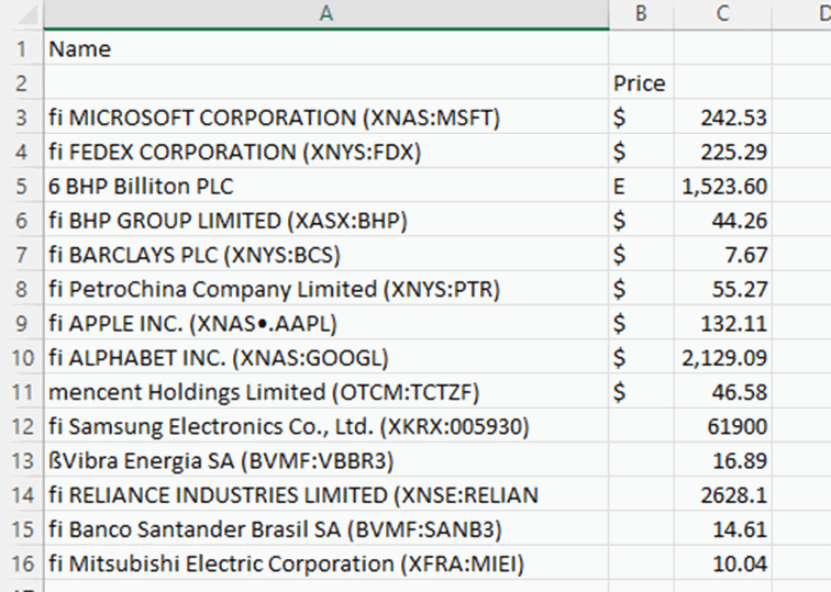 Look for other minor glitches such as the incorrect characters for the Apple stock code or the incorrect name for Tencent Holdings in row 11. Plus, of course, all the prefix characters in Col A caused by the LDT Stock symbol in the original picture.