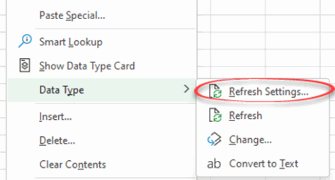 See the refresh options by right-clicking on a data type cell then Data Type | Refresh Settings.