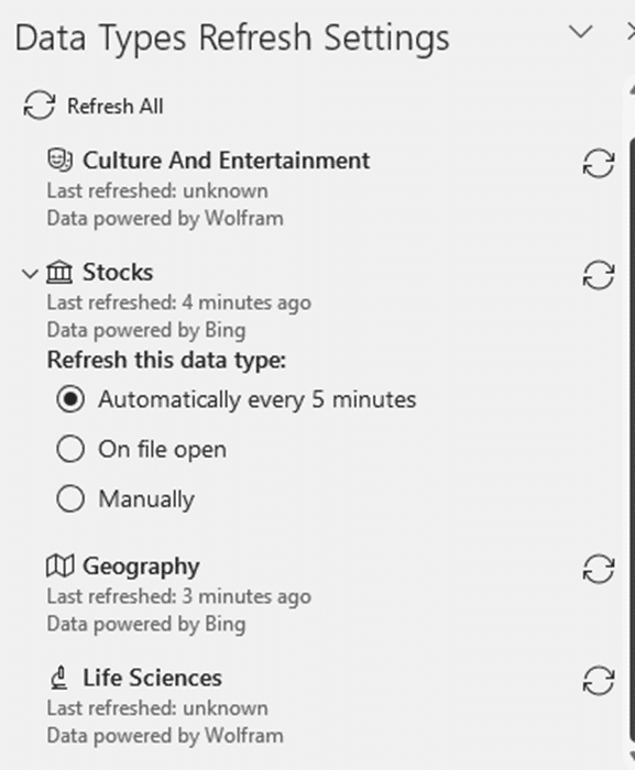 That opens a Data Types Refresh Setting pane which shows all the active data types and their refresh status. For most data types there are no refresh options but under Stocks (which includes Currency data) there are new choices.