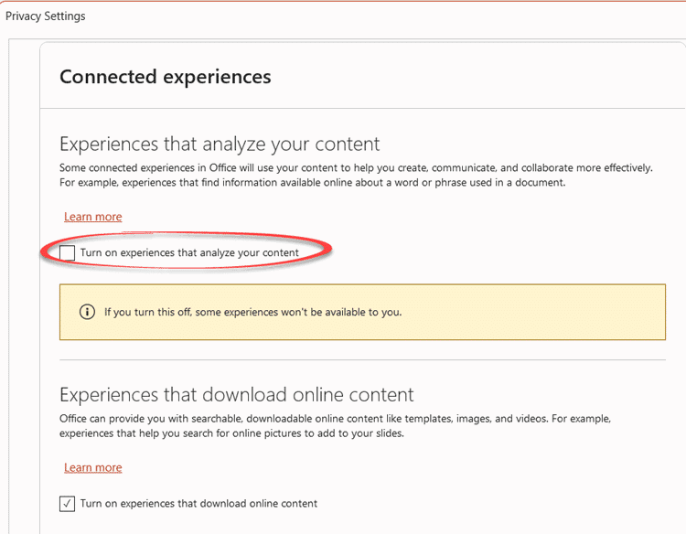 Go to File | Options | Trust Center | Trust Center settings | Privacy options | Privacy Settings and scroll down to “Experiences that analyze your content”
