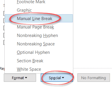 Open the Replace dialog and click More. Then Special and select Manual Line Break