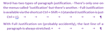 Now you can see what’s happening at the end of the stretched lines. Those angled arrows are Line Breaks which end a line but not a paragraph. With Justified Text, Word stretches text to the line break.