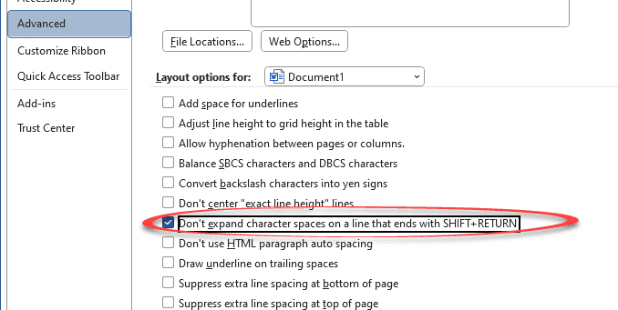Deep in Word’s options is a way to stop lines ending with Line Breaks (Shift + Enter) from stretching.