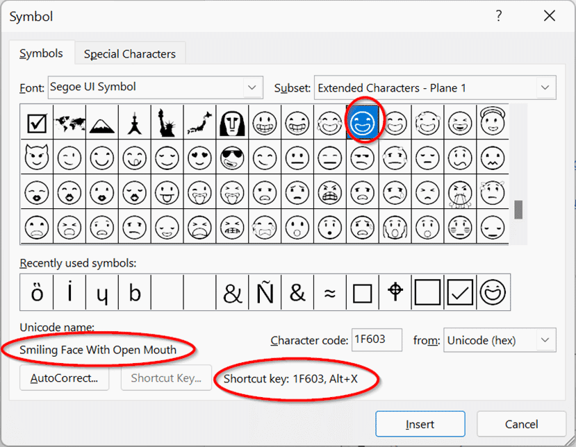 Use the standard Word Alt + X symbol shortcut 1f603 + Alt + X