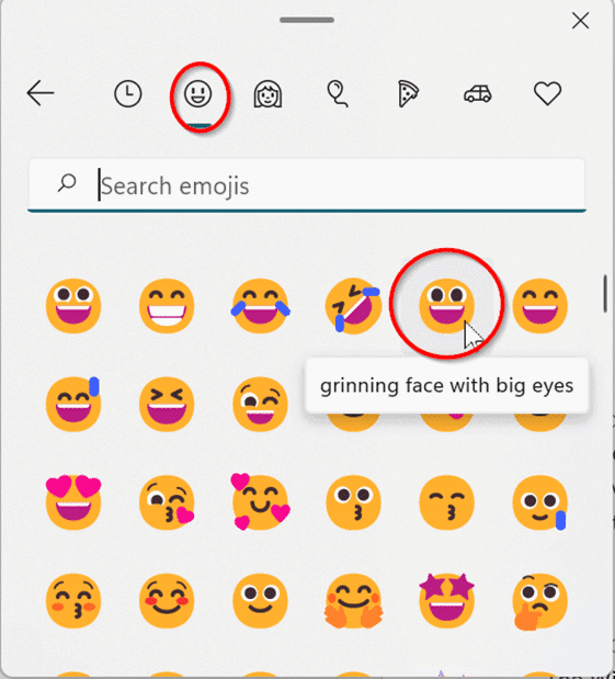 The Windows 10/11 Emoji Panel has the Grinning Face with Big eyes / Smiling Face with Open Mouth emoji 😃. Use Win + . (period/fullstop) to open the panel.