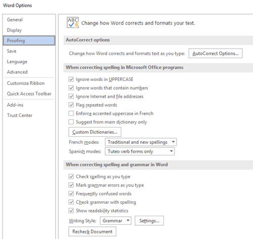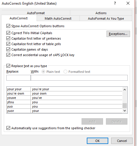 At the bottom of these options is ‘Automatically use suggestions from the spelling checker’ which ties the spell check to Autocorrect.