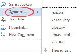 Microsoft Word has a thesaurus in some languages. Right-click on a correctly spelled word and choose Synonyms. Here we’re looking for synonyms of ‘thesaurus’: