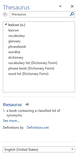 Or choose ‘Thesaurus…’ to see more in a side-pane. If your computer is connected to the Internet you’ll see extra options.