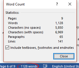 On the status bar is a Word Count, click on that to see some more document statistics: