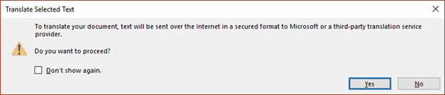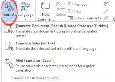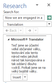 Translate Selected Text – is much the same but only for the current selection. The result appears in the Research pane and you have to scroll down to see it.
