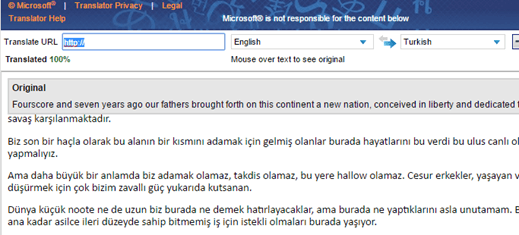 Translate Document will send the entire document for translation. You can select other languages from the pull-down lists at the top of the web page. Mouse over the translated text to see the original.
