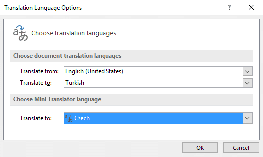 Change the default languages for these options from Review | Translate | Choose Translation Language. As you can see, different languages are possible for the full and mini translator.