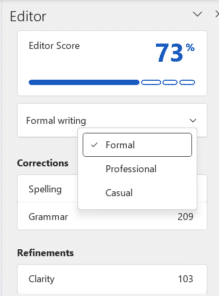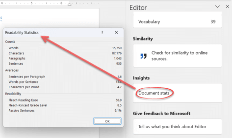 Microsoft Editor is an enhanced grammar and readability tool available in Word 365. Go to Review | Editor or press F7 to start