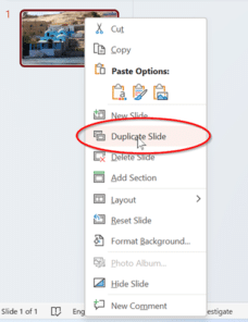 Next, right click on the slide in the left-hand column, and choose duplicate slide.