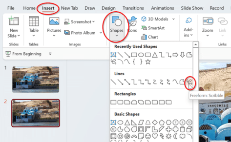 Click on the second slide, then go to Insert | Shapes | Lines | Freeform: Scribble