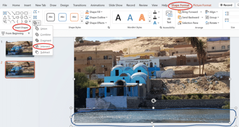 Now you need to click on the background first, then hold down the shift key and the shape you’ve just drawn so that both objects are selected. Go to Shape format | Insert Shapes | Merge Shapes | Intersect.
