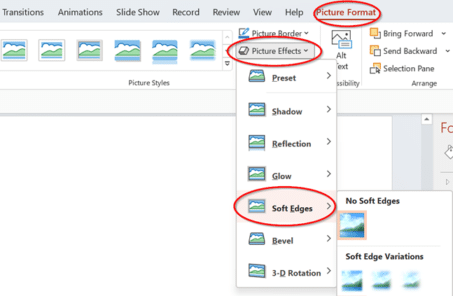 Go to Picture Format | Picture Styles | Picture Effects | Soft Edges | Soft Edge Variations and select your preference, in our case due to the size of our image, we selected 2.5 Point, this can be increased or decreased depending on the size of the area.