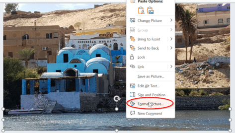 Before continuing, it’ll be easier if we can distinguish between the added image and the background. Firstly, right click on the image we recently pasted into the PowerPoint slide and select Format Picture.