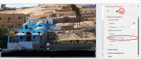 Now we can adjust the image back to normal brightness. Right click on the image and go to Format Picture | Picture | Picture Corrections and change Brightness back to 0%.