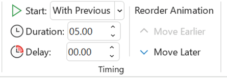 The timing of your animations is also important. In the Timing pane there is the: