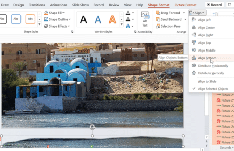 Go to Shape Format | Arrange | Align | Align Left and then Align Bottom