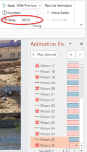 Go to your Animation Pane, scroll down to the bottom, highlight the bottom two animations, and add a delay on 00.50 seconds.