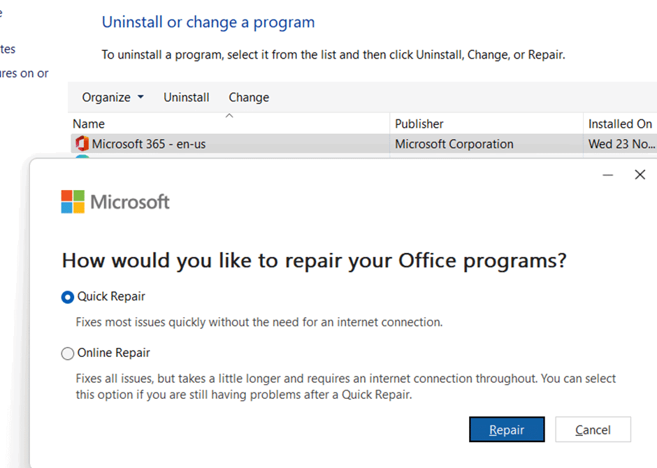 Try Quick Repair first. If that doesn’t help, there’s the slower ‘Online Repair’ option.