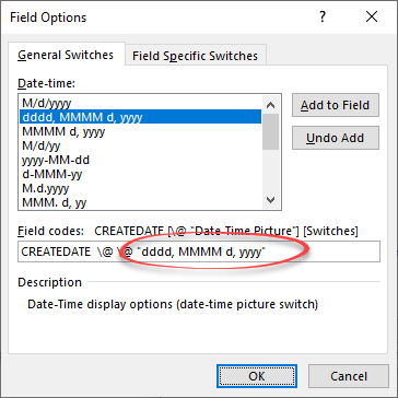 The Field Codes line can be changed. If you want a different date/time format, select the preset format closest to what you want, then edit it to what you need.