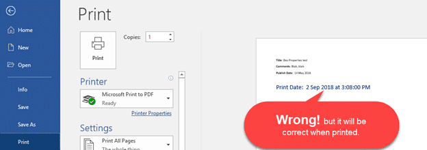 Note: the Print Preview pane shows the wrong Print Date but that’s OK. It’s showing the last time the document was printed. No problem, the date/time you click the ‘Print’ button will be updated automatically before printing.