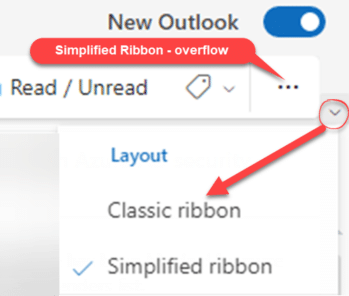 The smaller or simplified ribbon is available as an alternative to the full ribbon. It’s similar to the Outlook 365 desktop with the three-dots button showing the many overflow options.
