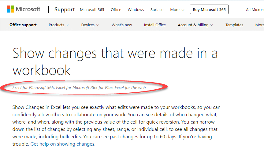 According to Microsoft’s own documentation, Show Changes is available in “Excel for Microsoft 365 Excel for Microsoft 365 for Mac Excel for the web”