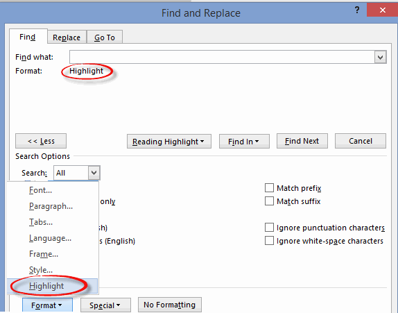 This example will find all highlighted parts of the document (an empty ‘Find What’). Use Format | Highlight to find highlights (any color).