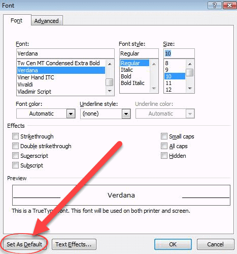 After making all the required changes and setting the font style, size, color, etc. click on “Set As Default” button located at bottom left corner of the Font window.