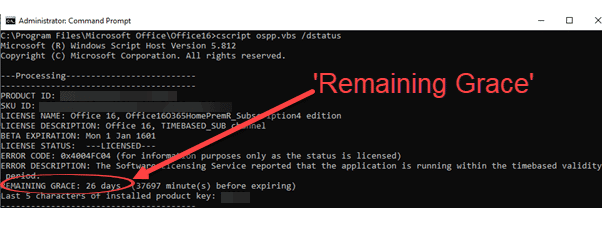 In a Command Prompt window, you can see more license details including the ‘Remaining Grace’ period for your Microsoft 365/Office 365 license.