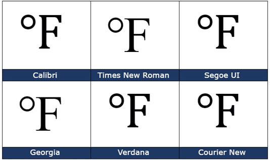 Here’s some examples of how Degree Fahrenheit ℉ looks in common Office fonts. Notice the kerning or overlap where the degree sign is close to the letter.
