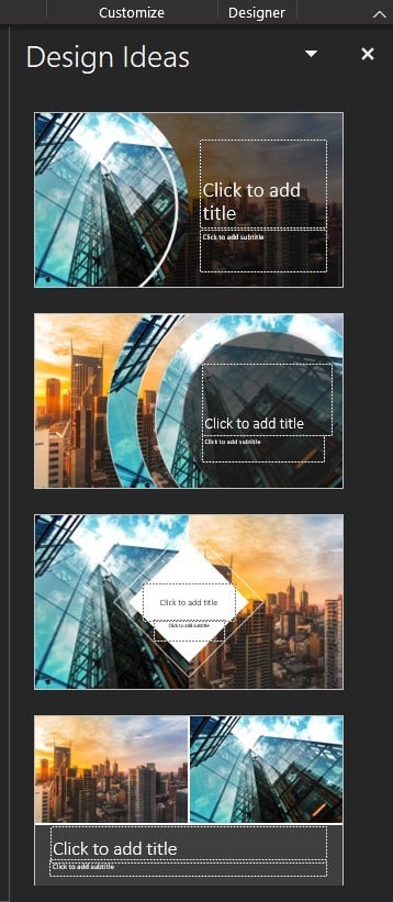 Clicking this opens the Design Ideas Pane. PowerPoint uses its cloud service to suggest designs for the slide elements.