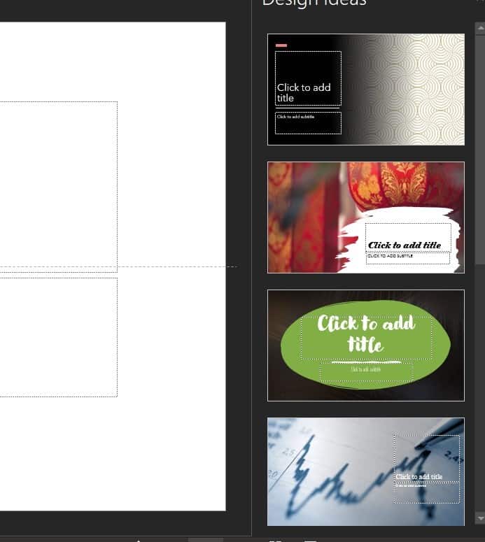 Create a new Blank Slide. As before, Design | Design Ideas and you’ll access the Design Ideas Pane. They should be different this time as it will have a selection of Automatically Generated Ideas for you to choose from