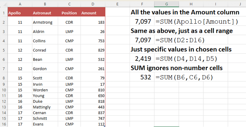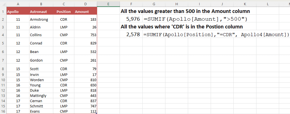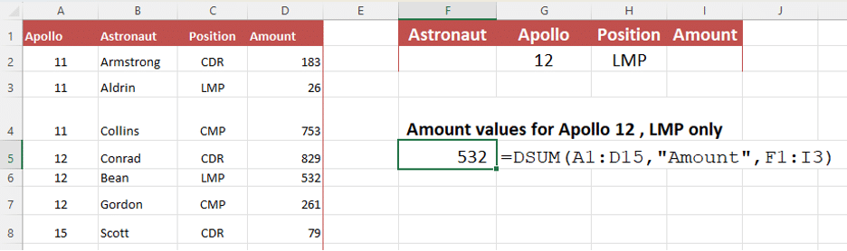 In these examples we’re using the table A1:D15, adding up values in the ‘Amount’ column, filtered with the settings in the table F1:I3. First, just add up the Apollo 11 amounts (filtered by the ‘11’ in G2).