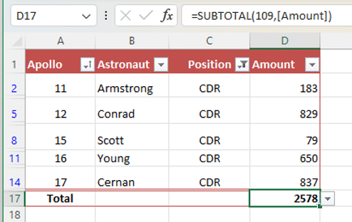 Subtotal() only includes rows that are filtered from a table, unlike SUM() which includes the entire table range regardless of the current filter. In this example, Subtotal() is only adding up the filtered rows (CDR or Commander only) not the entire table.