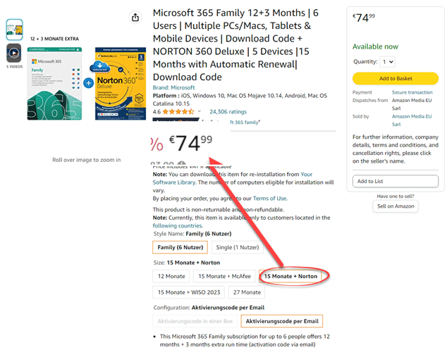 The best deal is a common bundled offer, Microsoft 365 Family plus a limited subscription to some other software (usually anti-virus) for €74.99 for 15 months.