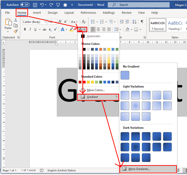 To add a gradient effect to text, select the text, then on the Font group of the Home tab, click the arrow next to the font color button. At the bottom of the dropdown, select Gradient.