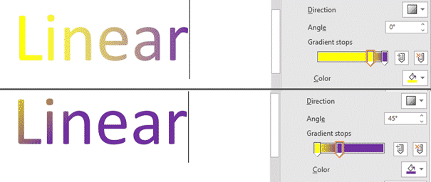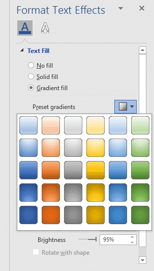 - When you set a gradient, the next time you open Format Text Effects it will default to whatever your last used settings were. The easiest way to reset it to something more neutral is to select one of the Presets and go from there.