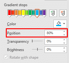 Instead of dragging the stops into place, you can use the Position setting to fine tune the positioning. If we want our rainbow colors to be evenly spaced we can use the spinner or type in the numbers so that the stops are at 20%, 40%, 60% and 80%.