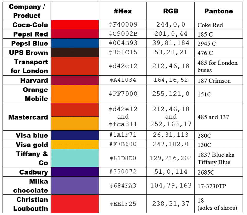 Here’s a list of just a few trademarked colors including all those mentioned above. The #Hex values can be used in the modern Office color picker otherwise RGB will work. In trademark applications the Pantone colors are normally given. In some cases, Pantone has created a special ‘private’ color, see Coke Red and Tiffany Blue.