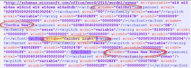 There’s a lot of detail but searching for ‘w:name=” will quickly find each of the fonts listed.
